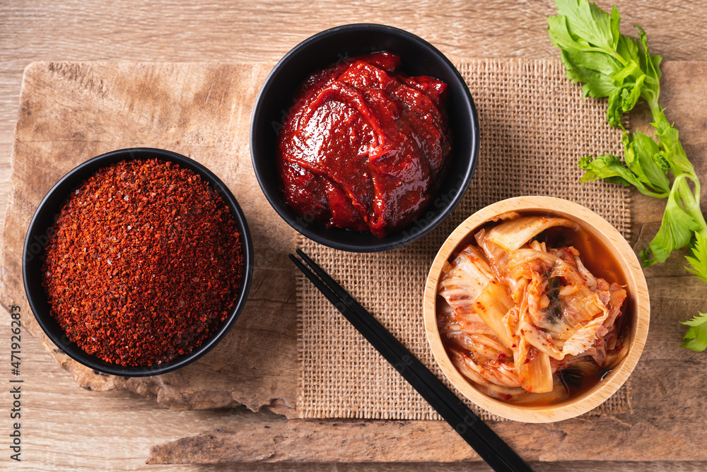 Korean Kimchi Cabbage With Gochujang Red Chili Paste And Chili Powder In Bowl On Wooden Background Table Top View Stock Photo Adobe Stock